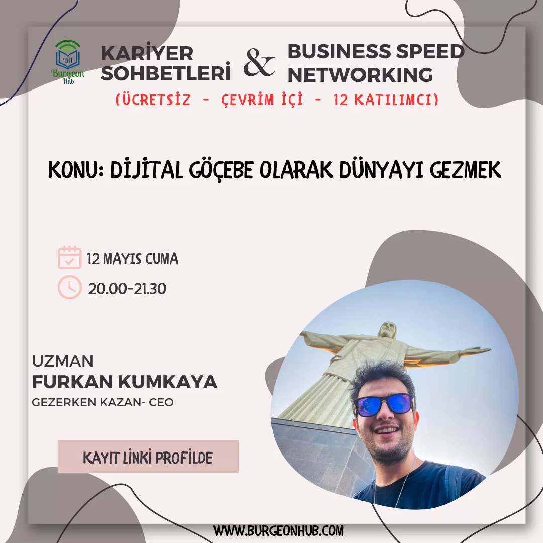 Etkinlikte bahsedeceğim diğer kısım ise dijital göçebe yaşamının fırsatları, güzel yanları ve zor yanları olacak. Benim hakkımda bilgi edinmek için Instagram hesabıma bakabilir, 300’den fazla iş fikrini anlattığımız Gezerken Kazan web sitemizi ziyaret edebilir ve kurmuş olduğumuz Digital Nomad Türkiye topluluğumuza göz atabilirsin.